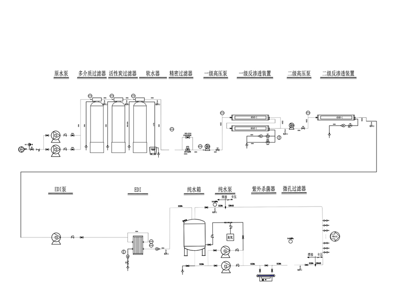 滲源純化水系統(tǒng)的RO系統(tǒng)由保安過濾器(有效防止水中的顆粒物容易劃傷RO膜表面,預防RO膜堵塞或穿孔)、阻垢劑單元(阻止鈣鎂離子容易對RO膜表面過快結垢)、一級高壓泵、一級反滲透裝置、中間水箱、二級高壓泵、二級反滲透裝置、純化水儲罐,及所需配備的檢測儀表和管路組成。