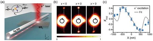 圖 (a) 手性拉曼的定向耦合的結(jié)構(gòu)體系:多層二硫化鎢上的銀納米線;(b)二硫化鎢的拉曼成像;(c)不同激光光斑-銀線距離下的拉曼光的定向性