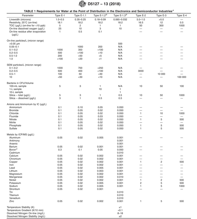 ASTM-D5127電子及半導體工業(yè)用純水水質要求