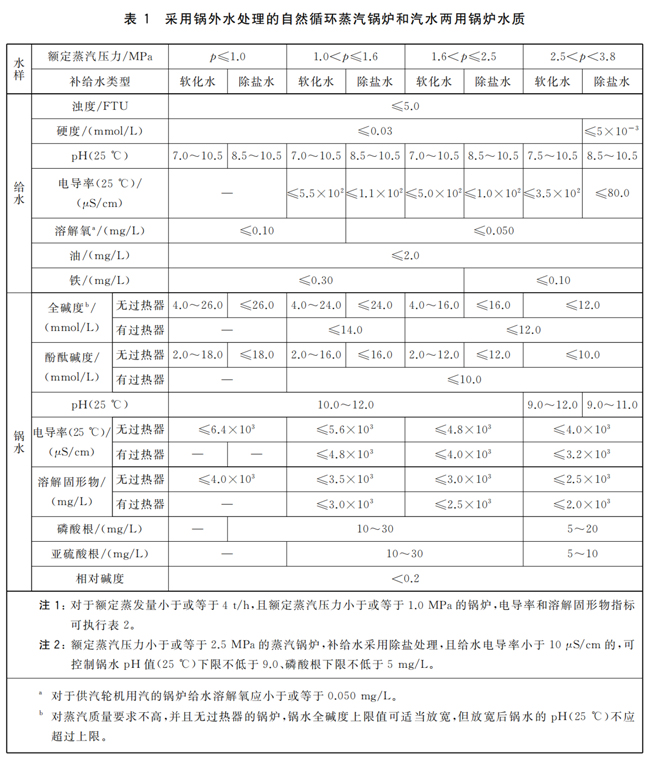 2.1 采用鍋外水處理的自然循環(huán)蒸汽鍋爐和汽水兩用鍋爐的給水和鍋水水質(zhì)應符合表1的規(guī)定。