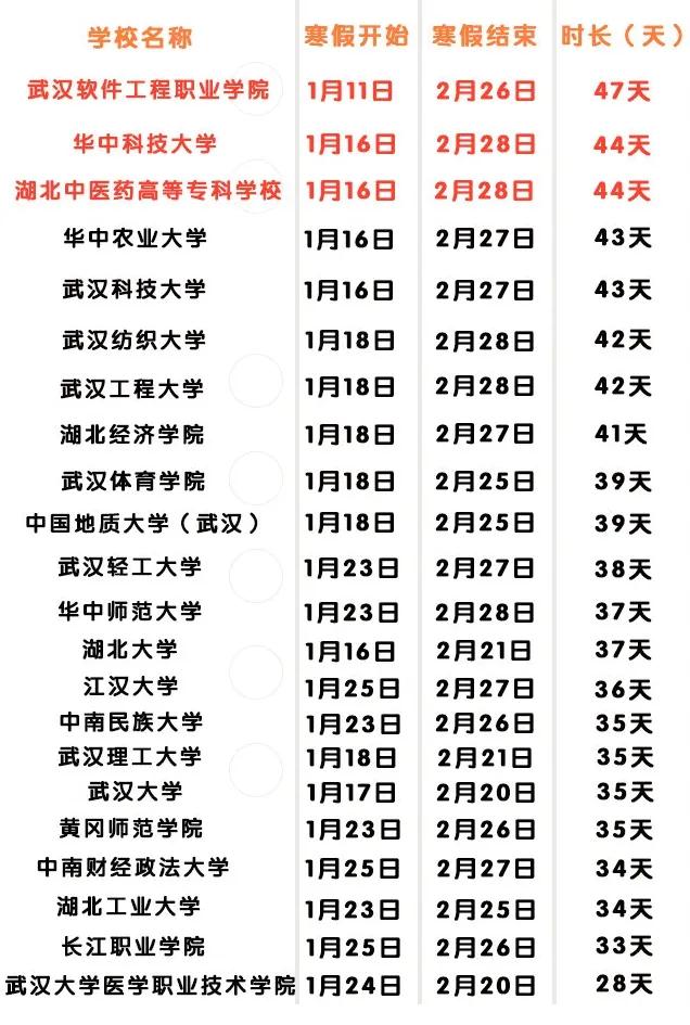 隨著2020年即將過去,2021年即將到來,湖北省2021年的節(jié)假日安排已經(jīng)出爐,公布了2021年元旦、春節(jié)、國慶等國家法定節(jié)假日的安排,同時伴隨著湖北省2021年節(jié)假日的出爐,全省各地高校的寒假安排也進行了公布,最早開始放寒假的武漢軟件工程職業(yè)學院,從1月11日開始就放寒假了,最遲的大學是長江職業(yè)技術學院,中南財經(jīng)政法大學,需要到1月25日才開始放寒假。