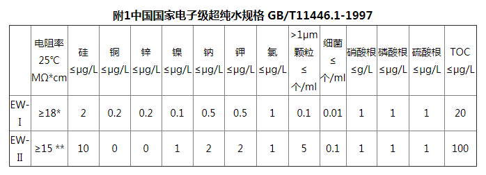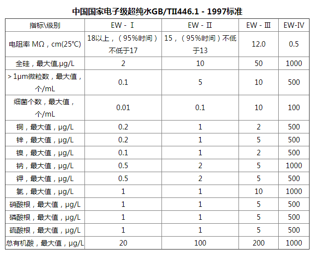 中國(guó)國(guó)家電子級(jí)超純水規(guī)格GB/TⅡ11446.1-1997標(biāo)準(zhǔn)