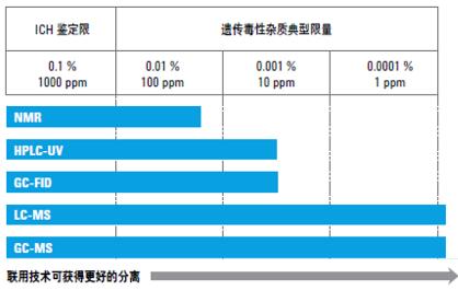 隨著分析技術(shù)的不斷進步和分析方法的不斷優(yōu)化,對于基因毒性雜質(zhì)檢測的靈敏度要求越來越高。以前,分析基因毒性雜質(zhì),將 HPLC (配有 UV/Vis 檢測器)及 GC(配有 FID 檢測器)作為常規(guī)分析方法。近年來,LC-MS和GC-MS等分析方法正在被越來越多的使用,檢測限一般在ppb級,以獲得更高的靈敏度和特異性。