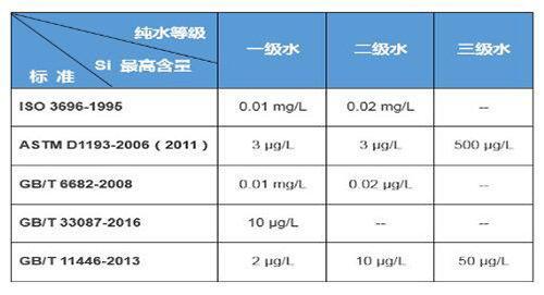 目前比較通用的純水標(biāo)準(zhǔn)包括ISO 3696-1995、ASTM D1193-2011、GB6682-2008、GB/T33087-2016、GB/T11446-2013。這些標(biāo)準(zhǔn)除了對(duì)Na+、Cl- 離子的含量有明確規(guī)定外,還規(guī)定了硅含量的要求。