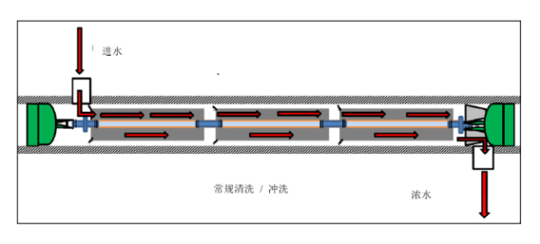 反滲透膜的正向清洗,是清洗液從壓力容器進(jìn)水端流入,經(jīng)過(guò)膜元件后從壓力容器濃水端流出,該流向與 RO 系統(tǒng)正常運(yùn)行時(shí)一致,是常見(jiàn)且有效的清洗方式。
