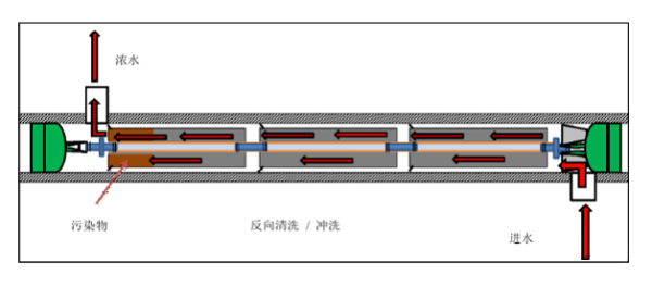 而反向清洗則是在某些特殊情況下采用的清洗手段,當(dāng)出現(xiàn)嚴(yán)重的生物、膠體、顆粒污染時(shí),污染物會(huì)在進(jìn)水端的首支膜上大量富集,此時(shí)正向清洗難以將這些污染物破碎并使其流過(guò)全部膜元件。但反向清洗,即清洗液從濃水端進(jìn)入,從進(jìn)水端流出,卻能更容易地洗脫污染物。