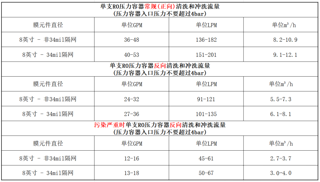 - 清洗流量限制設(shè)定:常規(guī)正向清洗時(shí),末端反滲透膜元件有止推環(huán)支撐保護(hù),不會(huì)受到擠壓變形。但反向清洗時(shí),首支膜沒(méi)有止推環(huán)保護(hù)。以 8 英寸膜元件為例,常規(guī)清洗流量為 136 - 182L/min,反向清洗時(shí)建議將流量限制在常規(guī)清洗流量的 2/3,即 91 - 121L/min;若壓差很高、污染嚴(yán)重,清洗流量要降至 1/3,即 45 - 61L/min,以此降低膜元件變形的可能性。對(duì)于采用 34mil 進(jìn)水隔網(wǎng)的膜元件,清洗流量比傳統(tǒng)膜元件稍大。清洗開始時(shí)應(yīng)先采用較低流量,然后根據(jù)實(shí)際壓差值緩慢提高,當(dāng)污染物脫除且壓差降低后,才能在常規(guī)流量下進(jìn)行反向清洗。