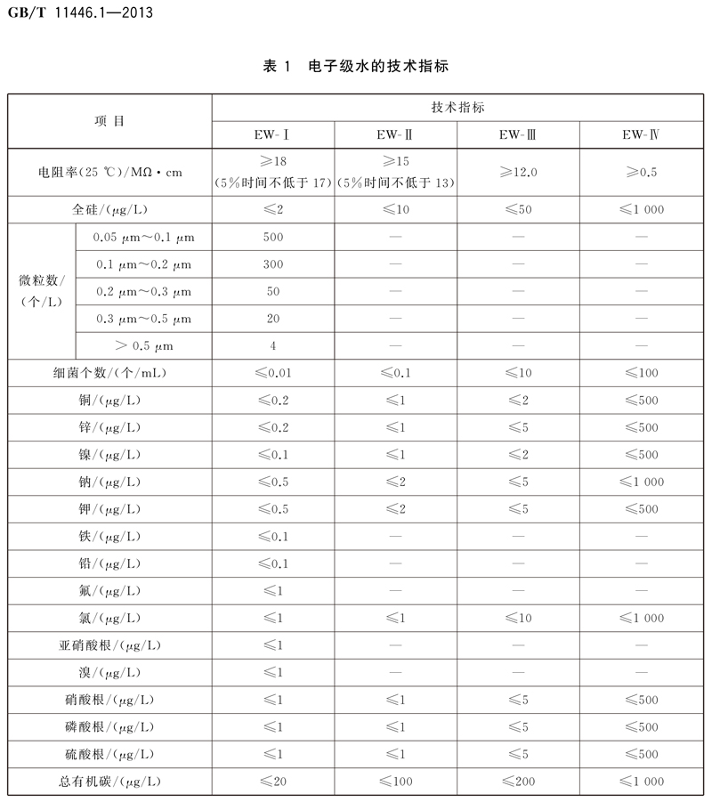 - 中國(guó)GB/T11446.1-2013電子級(jí)超純水電阻率:≥18.2MΩ.cm(25℃),全硅:≤2ppb,微顆粒物>0.05μm:500個(gè)/L,細(xì)菌個(gè)數(shù):≤0.01cfu/ml,TOC≤20ppb,金屬離子≤0.5ppb。