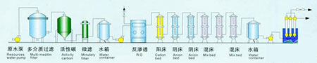 原水→原水箱→原水泵→多介質(zhì)過濾器→活性碳過濾器→軟化器→一級精密過濾器→一級反滲透→二級反滲透→臭氧發(fā)生器→純化水箱→紫外殺菌器→純水泵→用水點(diǎn)。